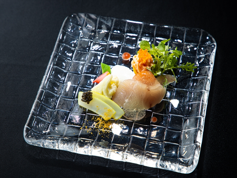 トマトのエキスとバーベナペッパーの香りを移したジュレでさっぱりと召し上がれます