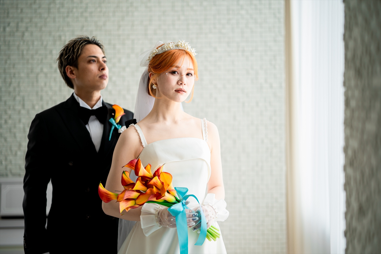 オレンジ色の髪の毛が印象的で、その色に負けないくらいの明るい笑顔が可愛い新婦ふゆこさん。